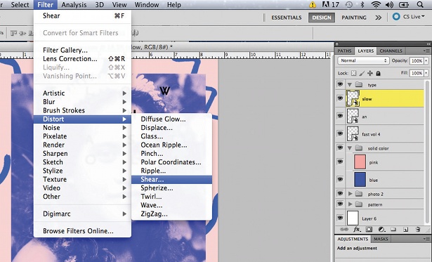 Sekarang untuk bagian yang menyenangkan. Setelah Anda memiliki tipe Anda di tempat dan itu ukuran benar, kepala ke menu Filter, pilih Distort dan klik Shear.