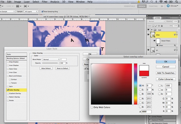 Setelah Anda memiliki tipe untuk salah satu kata-kata Anda di mana Anda inginkan, ulangi proses untuk setiap kelompok lain dari jenis yang Anda miliki - dalam kasus saya, 'An' dan 'Fast Vol. 4 '. Selanjutnya, Ctrl / klik-kanan pada layer, ubah blending mode ke Overlay Color dan memilih warna yang ingin Anda gunakan - dalam hal ini, putih.