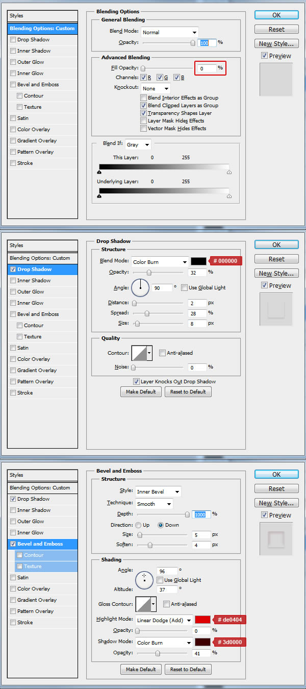 Pertama kita perlu membuat lapisan dari latar belakang. Untuk melakukan hal ini - klik kanan pada layer Background dan pilih "Layer dari latar belakang" nama sesuai keinginan dan tekan OK. Sekarang masuk ke Menu> Style> Layer Layer> Blending Options dan menggunakan pengaturan di bawah ini. Anda juga dapat mengakses Blending Options dengan dua cara lebih cepat. Cara pertama dan tercepat adalah dengan klik dua kali pada lapisan dalam menu lapisan Anda. Cara lain adalah dengan klik kanan pada lapisan dalam menu lapisan Anda dan pilih Blending Options. Ketika Anda selesai dengan semua pengaturan di bawah ini, jangan lupa untuk tekan tombol "OK" pada jendela Blending Options.